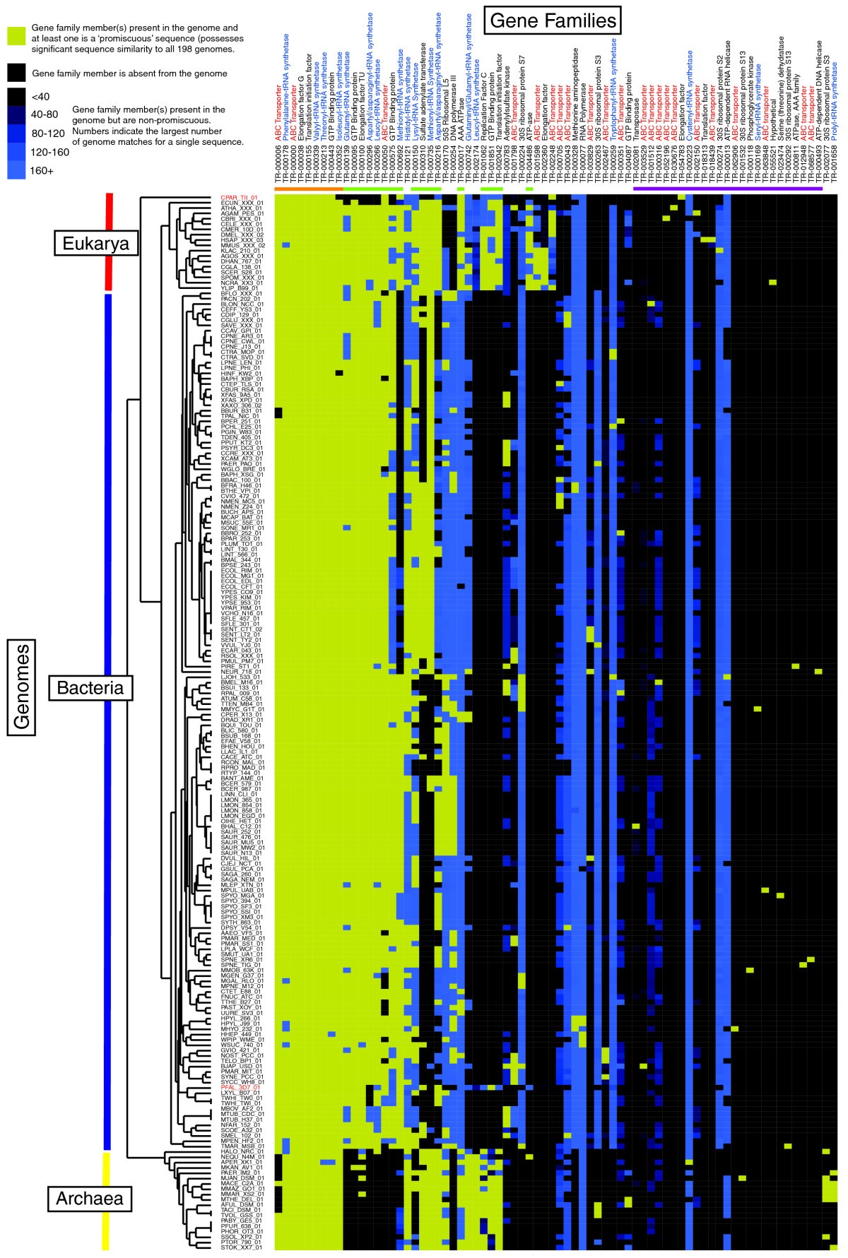 While the exploration of this spectrum of sequence specificity is being usefully exploited to derive novel evolutionary and functional relationships, much of the focus has centered on sequences of prokaryotic origin. This is primarily due to the greater number of bacterial genomes that have been sequenced to date. However, the high incidence of lateral gene transfer (LGT) events in prokaryotes has resulted in the lack of a robustly defined phylogeny and, hence, studies of sequence diversity have largely focused on the identification and characterization of sequences at the two extremes of the spectrum [1418]. On the other hand, while the taxonomic relationships in eukaryotes are more clearly defined, detailed systematic analyses of diversity within eukaryotes on the basis of fully sequenced genomes are precluded by the limited number and phylogenetic range of organisms that have been sequenced [19].